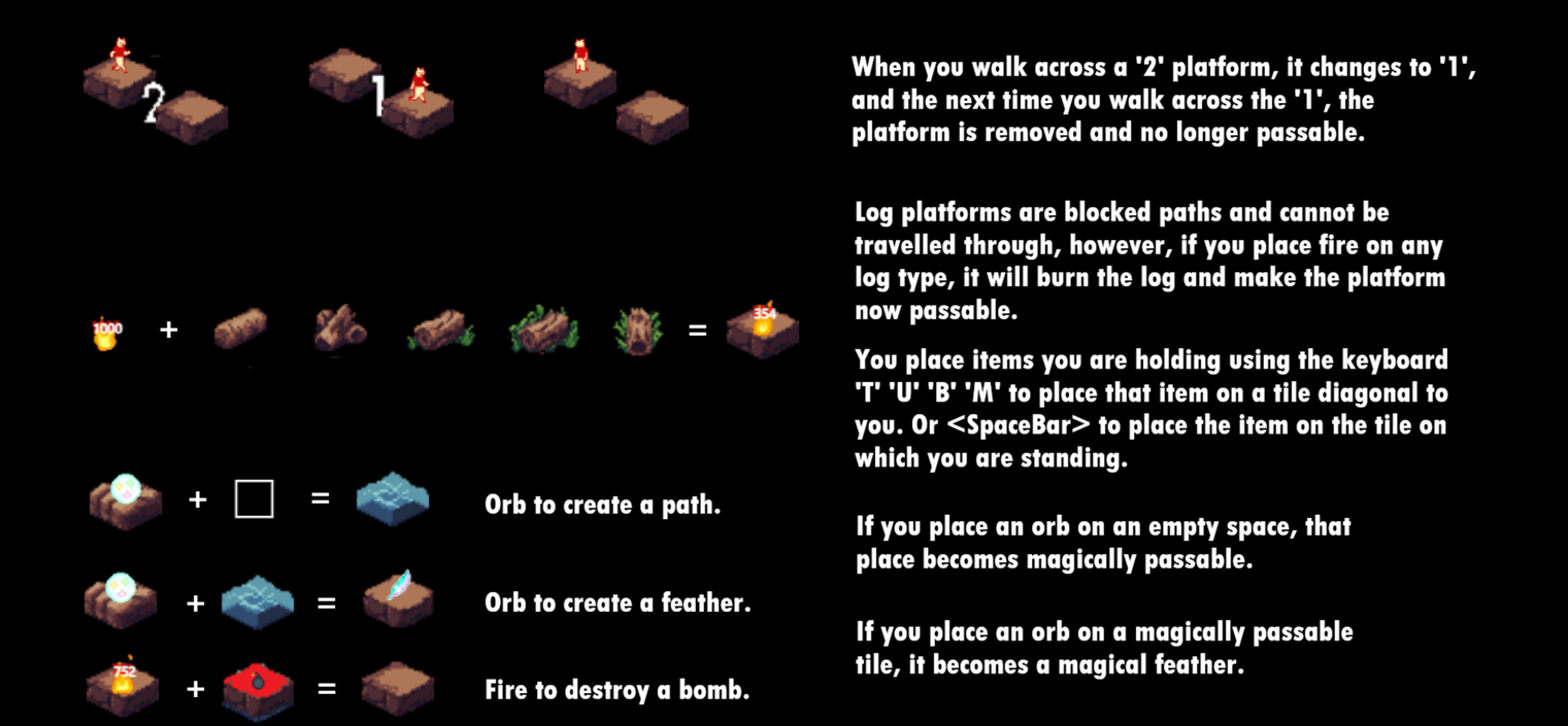 Place the fire, a bomb, or an Orb you are holding on adjacent empty spaces: T,U,B,M